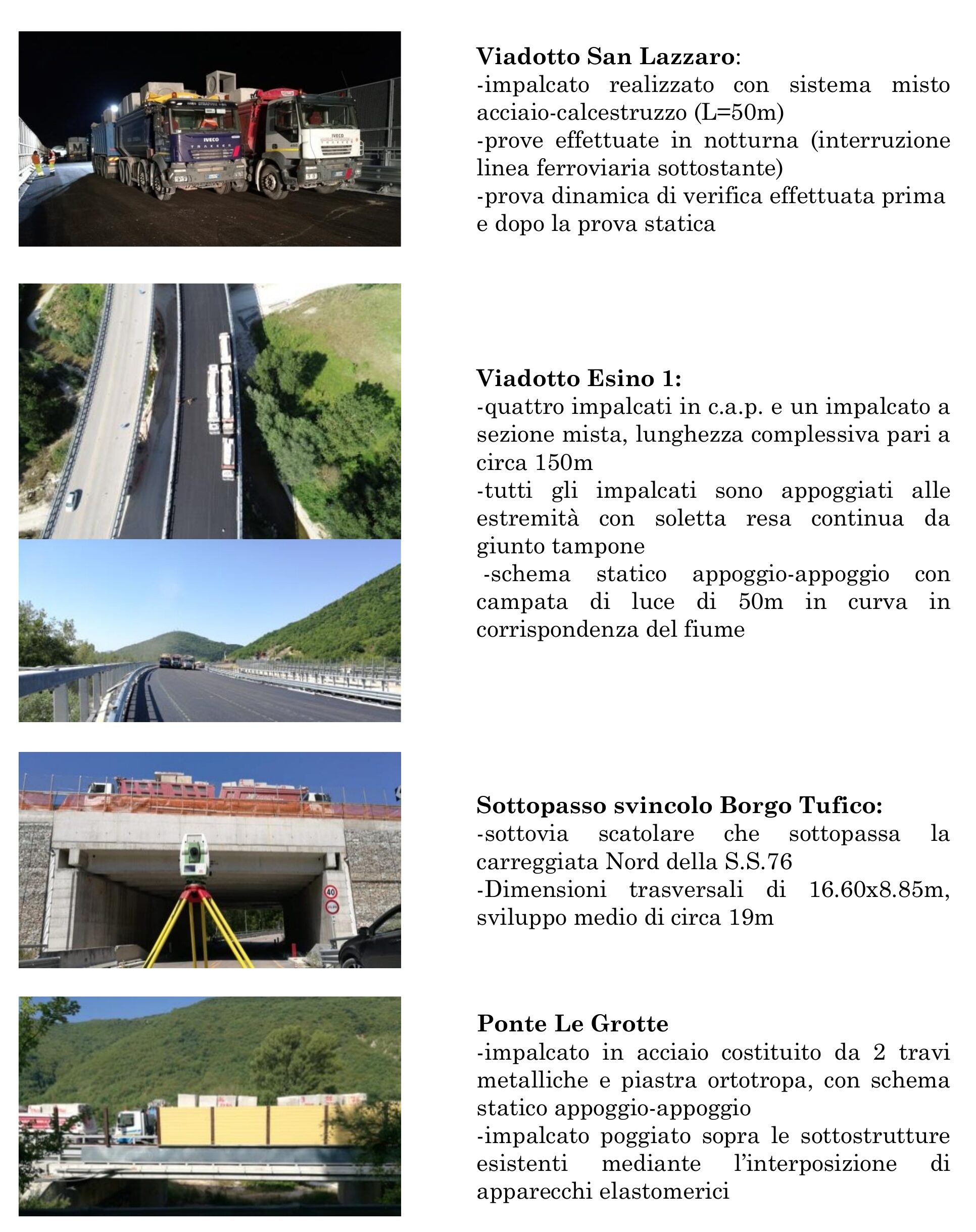 In detail, the road alignment of the SS.318 has a development of 8.5 km and it is entirely newly built. The main work that has been done are: N°2 interchanges (Pianello and Valfabbrica), N°4 Natural Tunnels (San Gregorio North/South), N°2 Artificial Tunnels (Della Donna North/South) e N°13 Viaducts (steel-concrete and pre-stressed reinforced concrete mixed section decks). Also, the road layout of the two sub-lots of the SS.76 has a development of 21 km and the new constructions of some sections of the road (including interchanges) and the adaptation and improvement of the other parts have been planned. The main works in the project are: N°5 interchange (Cancelli, Borgo Tufico, Valtreara, Camponocecchio and Serra San Quirico), N° 22 Natural Tunnels, N°2 Artificial Tunnels and N°24 Bridges and Viaducts (steel-concrete and pre-stressed reinforced concrete mixed section decks).